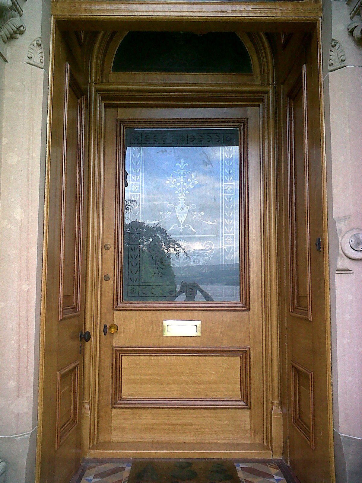 Oak Doors. The left Door is real panelled Oak, the right door is flat, which I Grained with Faux Trompe L'Oeil panels to match.